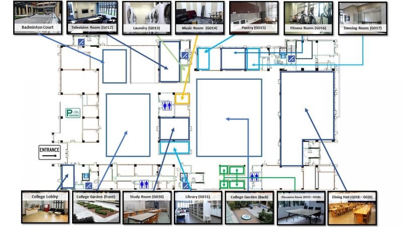 LCWC is laid out in a S-shape design. At each corner, there is a stairwell and lift. The ground floor contains public areas, offices, dining hall, and different function rooms including study room, meeting room, TV room, music room, gym room, sports activity room, laundry, and vendor machine zone. Students live in floors 1 through 6. A room for student who are disable and/or required wheelchair is available on the first floor.